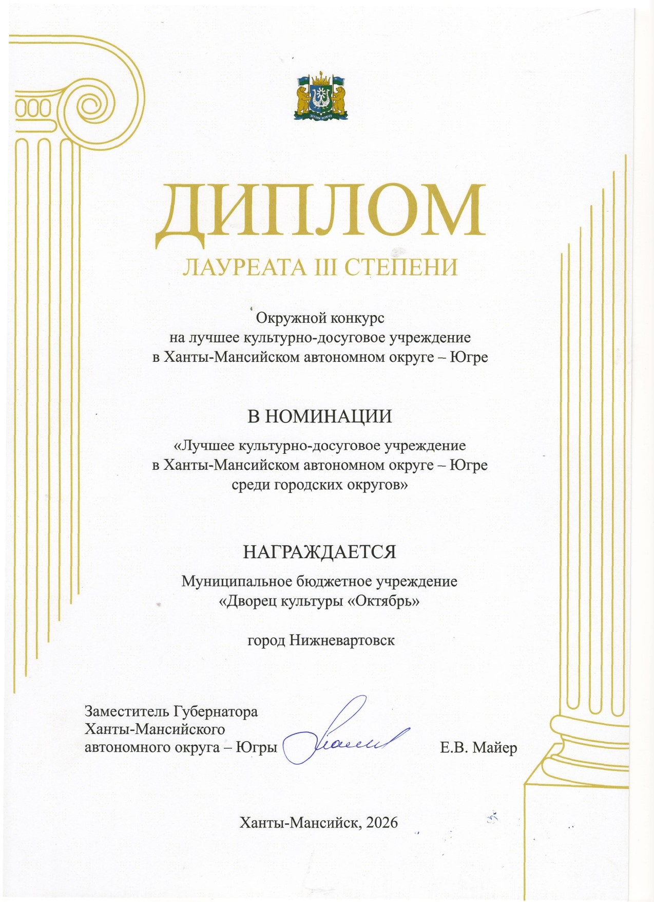 Муниципальное бюджетное учреждение «Дворец культуры «Октябрь» обладатель Диплома Лауреата 3 степени окружного конкурса на лучшее культурно – досуговое учреждение в Ханты – Мансийском автономном округе - Югре в номинации «Лучшее культурно – досуговое учреждение в ХМАО -Югре среди городских округов».