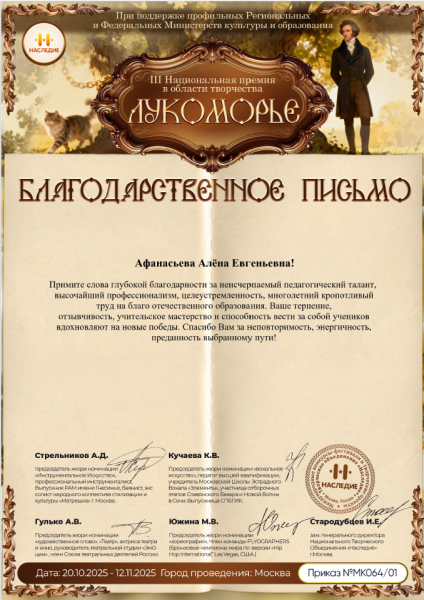 Благодарственное письмо Афанасьевой А.Е. за неисчерпаемый педагогический талант, высочайший профессионализм, целеустремленность, многолетний кропотливый труд на благо отечественного образования. Ваше терпение, отзывчивость, учительское мастерство и способность вести за собой учеников вдохновляют на новые победы. Спасибо Вам за неповторимость, энергичность, преданность выбранному пути!