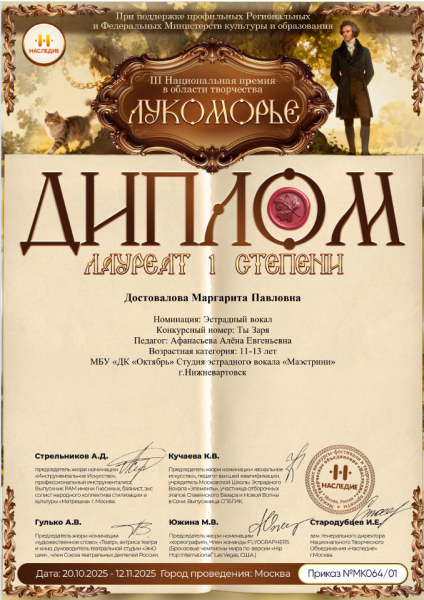 Лауреат I степени – Достовалова Маргарита: «Эстрадный вокал», 11-13 лет.