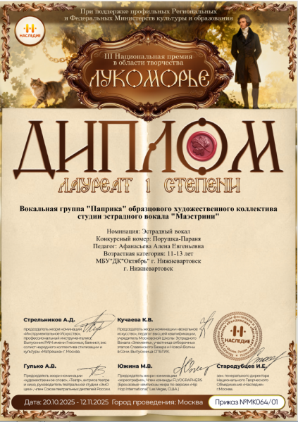 Лауреат I степени – вокальная группа «Паприка»: «Эстрадный вокал», 11-13 лет.