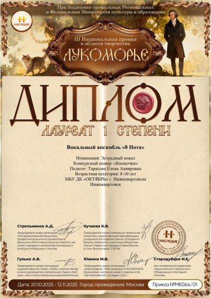 Лауреат I степени – вокальная группа «8 нота»: «Эстрадный вокал», 8-10 лет.