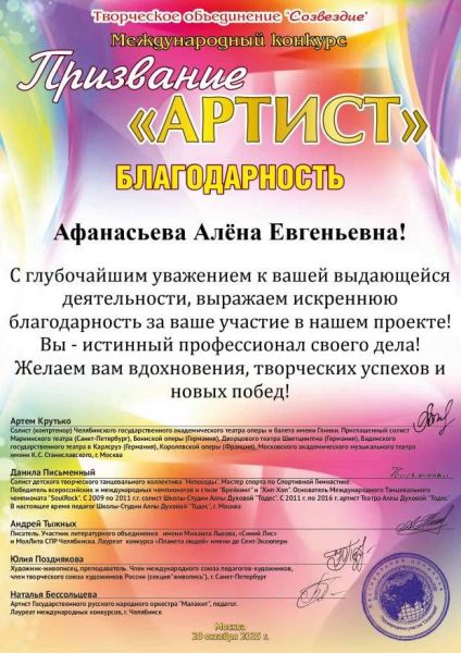 Благодарность Афанасьевой А.Е. - выражаем искреннюю благодарность за ваше участие в нашем проекте! Вы истинный профессионал своего дела! Желаем вам вдохновения, творческих успехов и новых побед!
