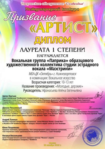 Лауреат I степени – вокальная группа «Паприка»: «Вокальное искусство», 10-13 лет.