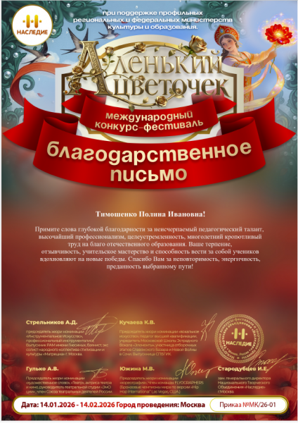 Благодарственное письмо Тимошенко П.И. - за неисчерпаемый педагогический талант, высочайший профессионализм, целеустремленность, многолетний кропотливый труд на благо отечественного образования. Ваше терпение, отзывчивость, учительское мастерство и способность вести за собой учеников вдохновляют на новые победы. Спасибо Вам за неповторимость, энергичность, преданность выбранному пути!