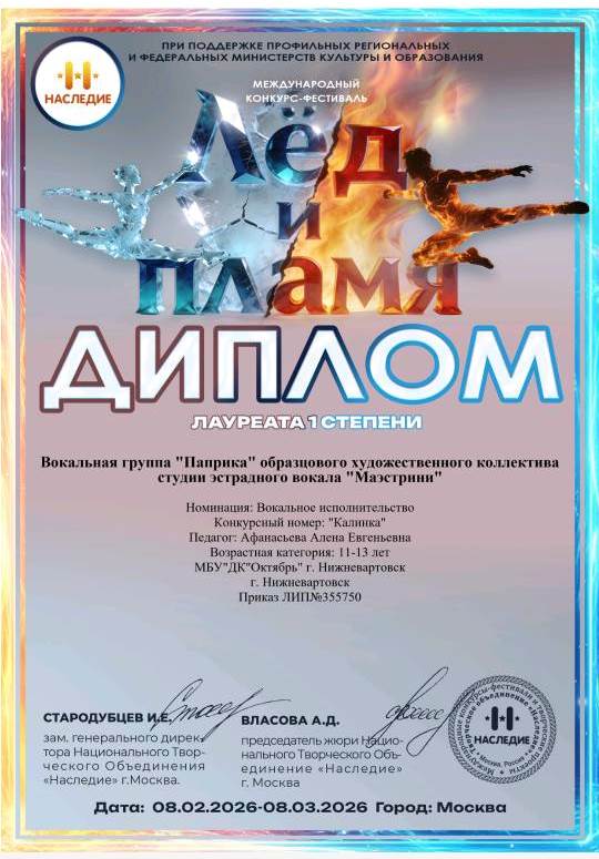 Лауреат I степени – вокальная группа «Паприка»: «Вокальное исполнительство», 11-13 лет.