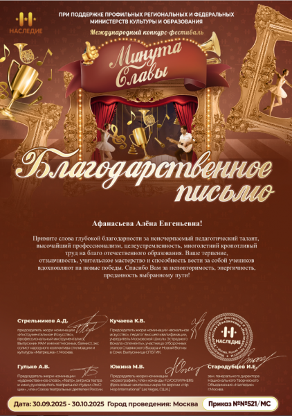 Благодарственное письмо Афанасьевой А.Е. за неисчерпаемый педагогический талант, высочайший профессионализм, целеустремленность, многолетний кропотливый труд на благо отечественного образования. Ваше терпение, отзывчивость, учительское мастерство и способность вести за собой учеников вдохновляют на новые победы. Спасибо Вам за неповторимость, энергичность, преданность выбранному пути!