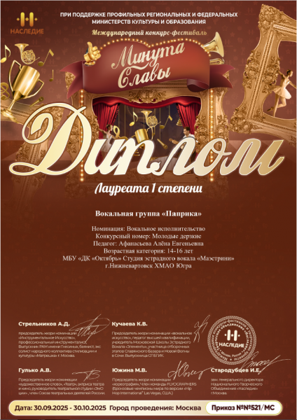 Лауреат I степени – вокальная группа «Паприка»: «Вокальное исполнительство», 14-16 лет.