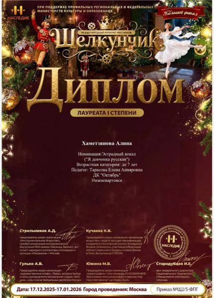 Лауреат I степени – Хаметзянова Алина: «Эстрадный вокал», до 7 лет.