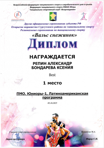 Диплом 1 место – Репин Александр, Бондарева Ксения: Юниоры-1, Латина.