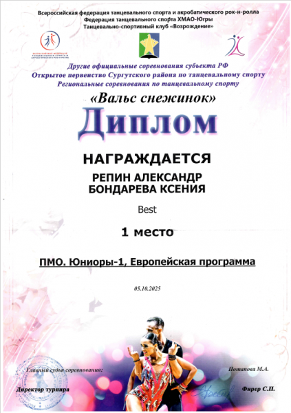 Диплом 1 место – Репин Александр, Бондарева Ксения: Юниоры-1, Стандарт.