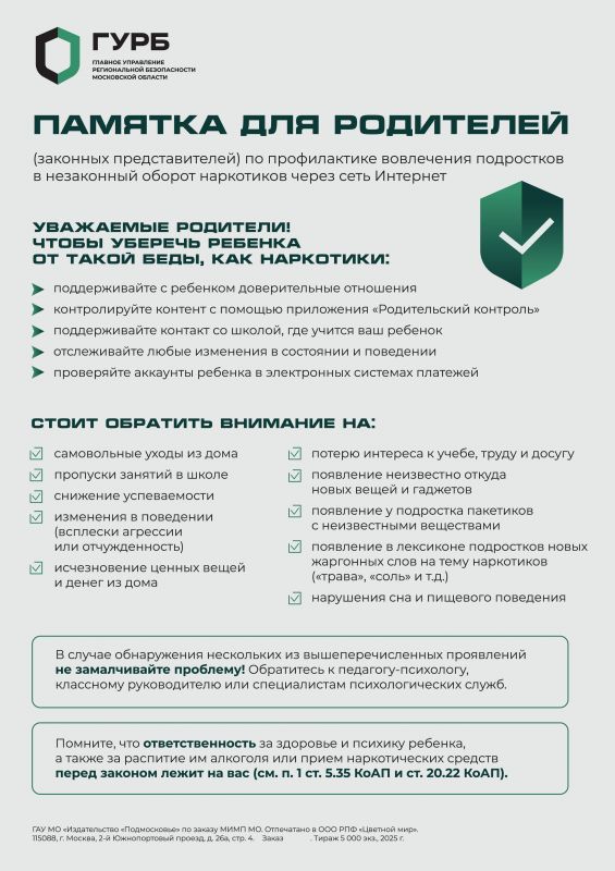 ПАМЯТКА ДЛЯ РОДИТЕЛЕЙ по профилактике вовлечения подростков в незаконный оборот наркотиков