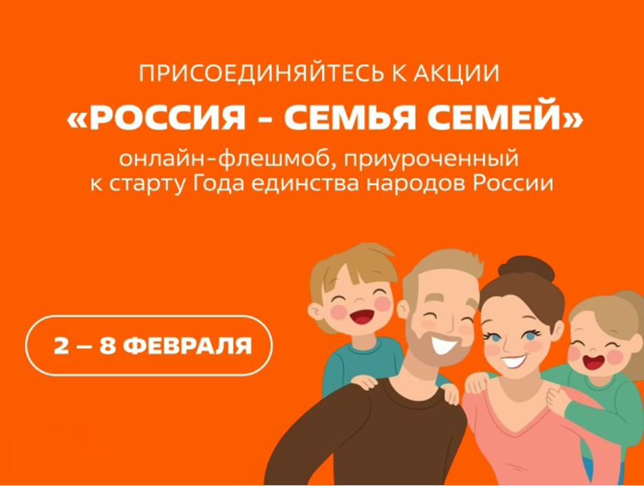 С 2 по 8 февраля 2026 года мы присоединяйтесь к масштабному Всероссийскому онлайн-флешмобу «Россия – семья семей»! Это прекрасная возможность в очередной раз показать единство, сплоченность и солидарность народов нашей многонациональной страны. Ведь именно в общих делах, во взаимной поддержке и уважении к традициям каждого народа заключается наша общая сила.
