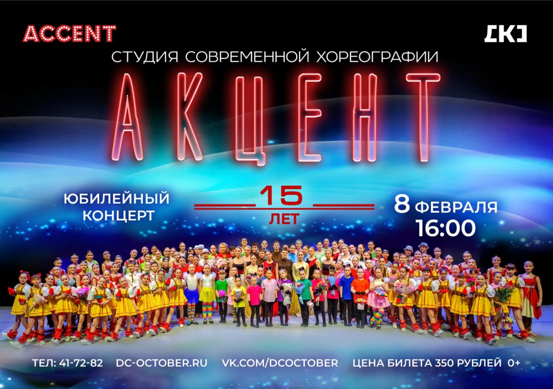 8 февраля 2026 года в 16:00 приглашаем вас на событие года – юбилейный концерт образцового хореографического коллектива студии современной хореографии «Акцент», руководитель Ольга Анголюк. В этот праздничный вечер сцена превратится в пространство, где оживают эмоции, а каждый танец рассказывает свою уникальную историю. Вот уже 15 лет «Акцент» дарит своим поклонникам энергию, грацию, любовь к движению и танцу. «Акцент» — это точность каждого движения, стиль и драйв, дружная семья, сотни побед на городских, международных и всероссийских конкурсах, история успеха!
