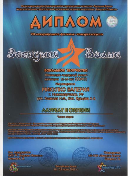 Благодарность – Ушаковой Н.Ф. – за высокий уровень подготовки участников VIII международного фестиваля-конкурса искусств «Звёздная волна» и весомый вклад в развитие художественного творчества и духовно-нравственного воспитания детей и молодёжи.