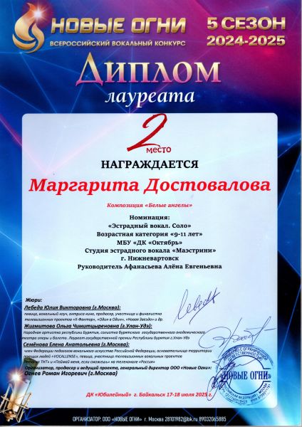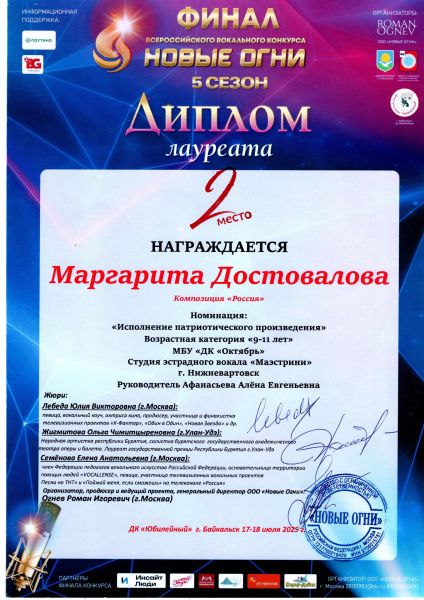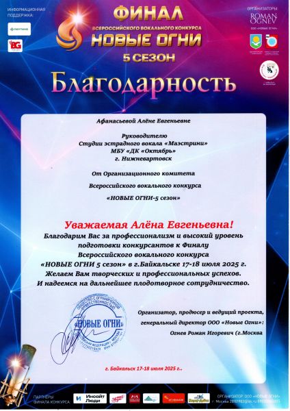 Благодарность Афанасьевой А.Е. – за профессионализм и высокий уровень подготовки конкурсантов к всероссийскому вокальному конкурсу «НОВЫЕ ОГНИ 5 сезон» в г. Байкальске 17-18 июля 2025 г. Желаем вам творческих и профессиональных успехов. И надеемся на дальнейшее плодотворное сотрудничество.